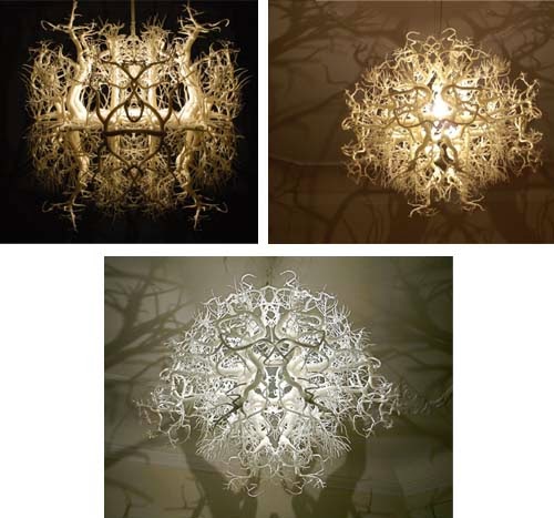 - Forms in Nature ideata da Thyra Hilden e Pio Diaz. Le ombre che crea questo lampadario sono quelle di una foresta fitta e indisciplinata. La fonte di luce è circondata da “rami” che proiettano le loro ombre sulle pareti di casa a 360 gradi. Sembra di entrare in una delle fiabe che leggevamo da bambini, dove il bosco era scuro e spaventoso, ma, nel nostro caso, per farlo sparire basta solo accendere la luce.