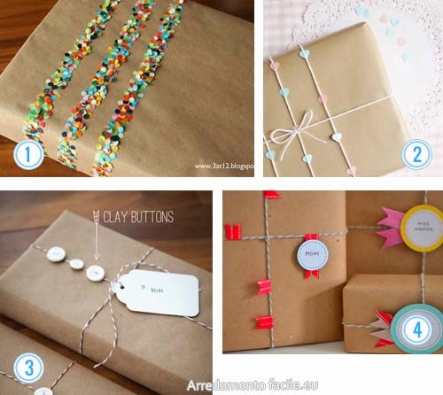 2: Con dei coriandoli colorati di diversa forma, attaccati ad un semplice spago, otterrete un pacco romantico e delicato.