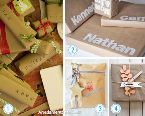 2: Stampate su del cartoncino le lettere dei nomi dei destinatari dei vostri regali con le dimensioni che preferite. Appoggiate le lettere su un vecchio libro o su un quotidiano e disegnatene i bordi, ritagliatele e incollatele sui pacchi.