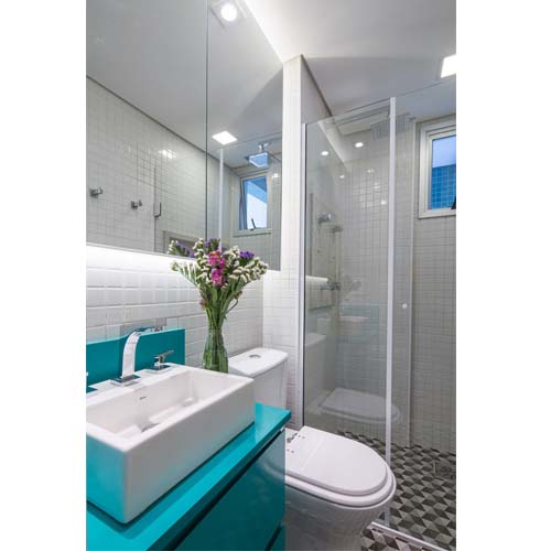 Anche nei bagni ritroviamo il colore: uno è caratterizzato da tocchi di giallo mentre nell’altro spicca il turchese. Ambienti piccoli ma ben progettati.