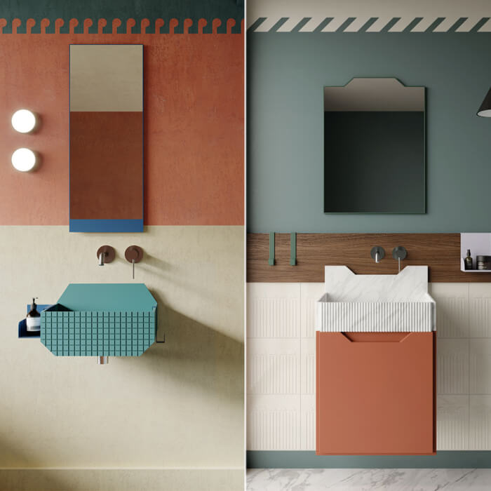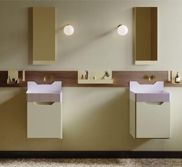 One High e One Low si ispirano agli antichi lavatoi, disponibili con o senza texture intrecciata frontale, e sono realizzati in Livingtec® in diversi colori: bianco, rosa cipria, lilla e blu brillante. Questi lavabi possono essere abbinati alla fascia posteriore a muro anch’essa declinata in diversi colori e materiali.