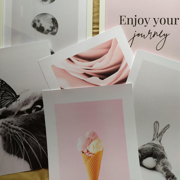 I poster che abbiamo scelto sono stati: Rabbit Reclining, Cat And Butterfly, Rose Close, Ice Cream Photo, Three Moons, Hold My Hand Grey, Enjoy Your Journey, tutti in formato 21x 30.